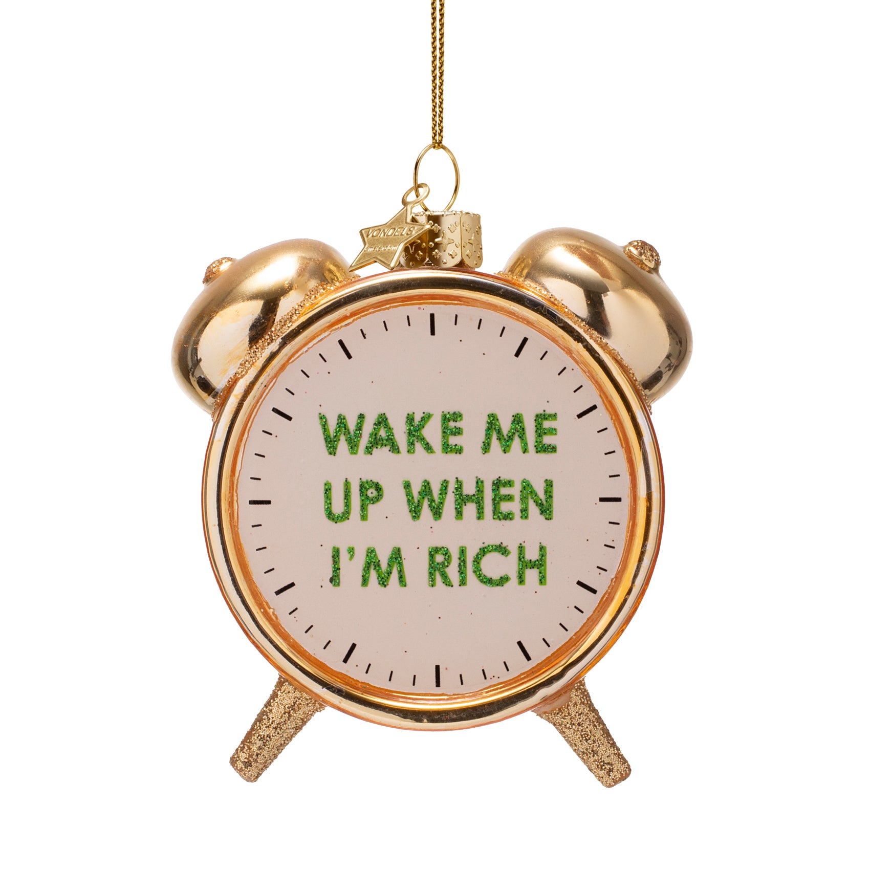 Tijd voor een beetje humor (en luxe) in je kerstboom! Dit glazen gouden wekker-ornament met de tekst “Wake Me Up When I’m Rich” is een echte conversation starter. Met zijn glanzende afwerking en speelse knipoog past dit ornament perfect bij iedereen met gevoel voor stijl én zelfspot.