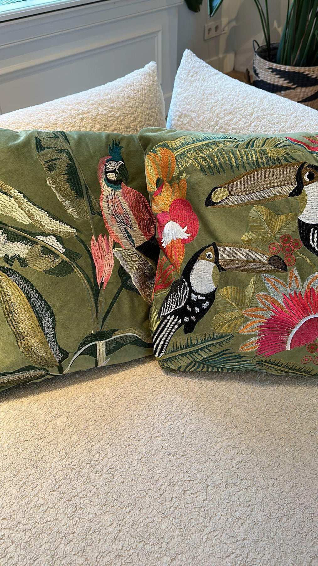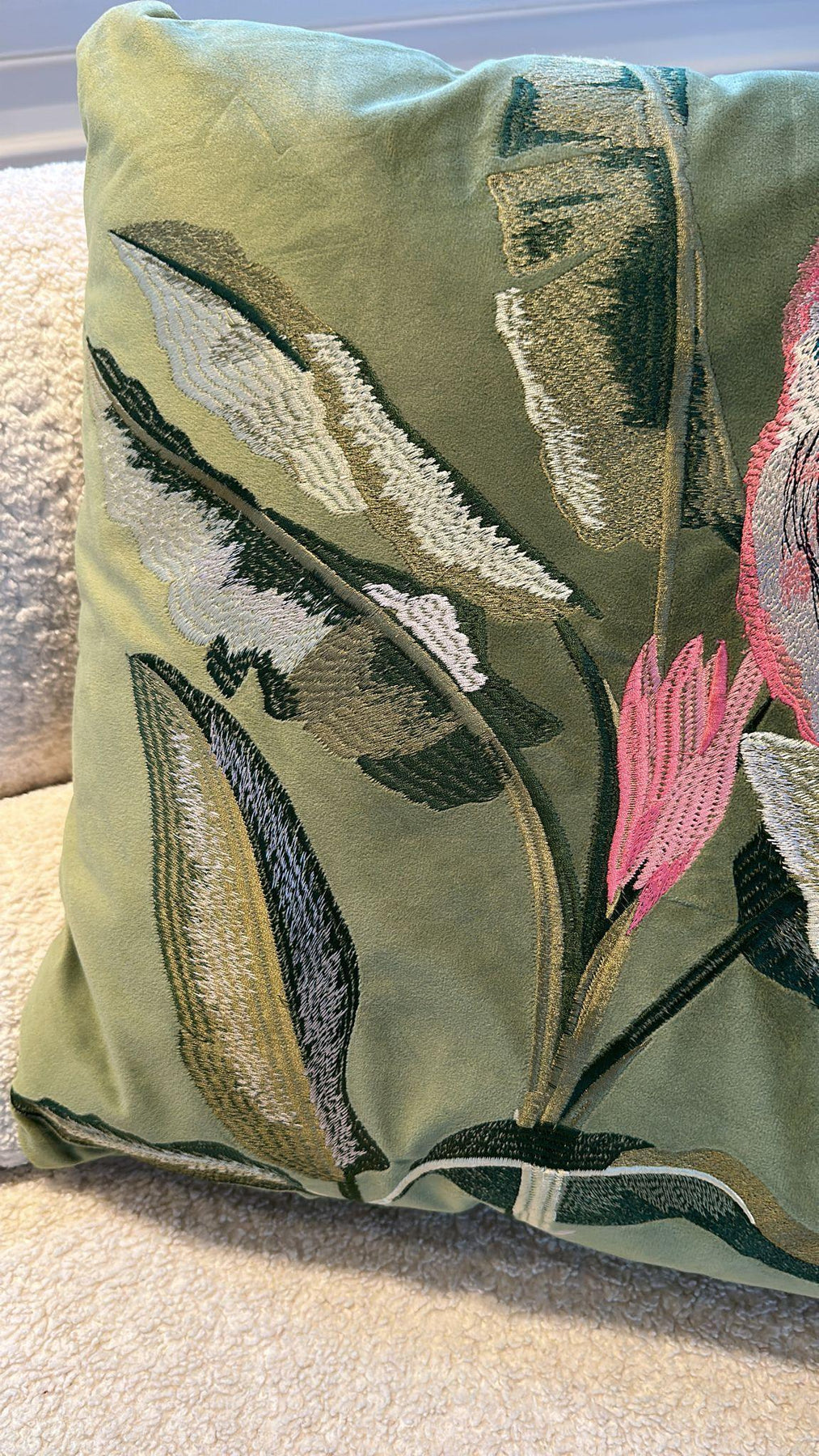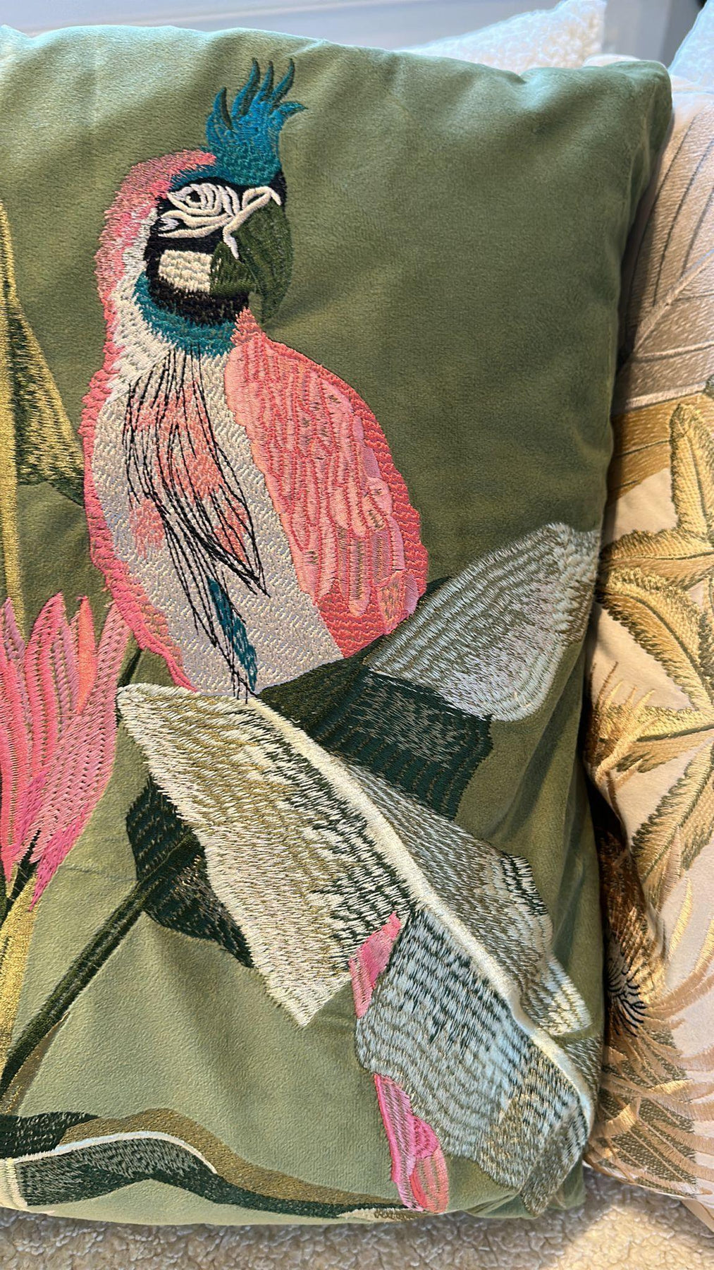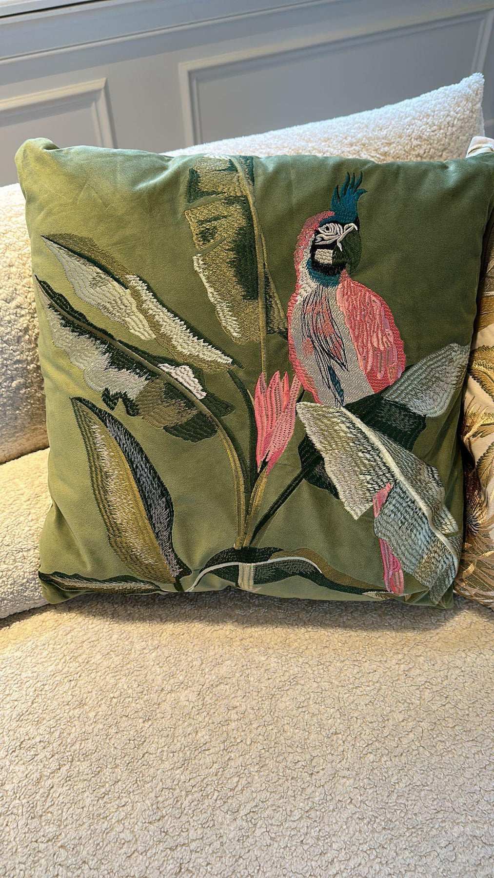 Dit prachtige sierkussen heeft een Green velvet kleur met parrotprint. Heel chique!