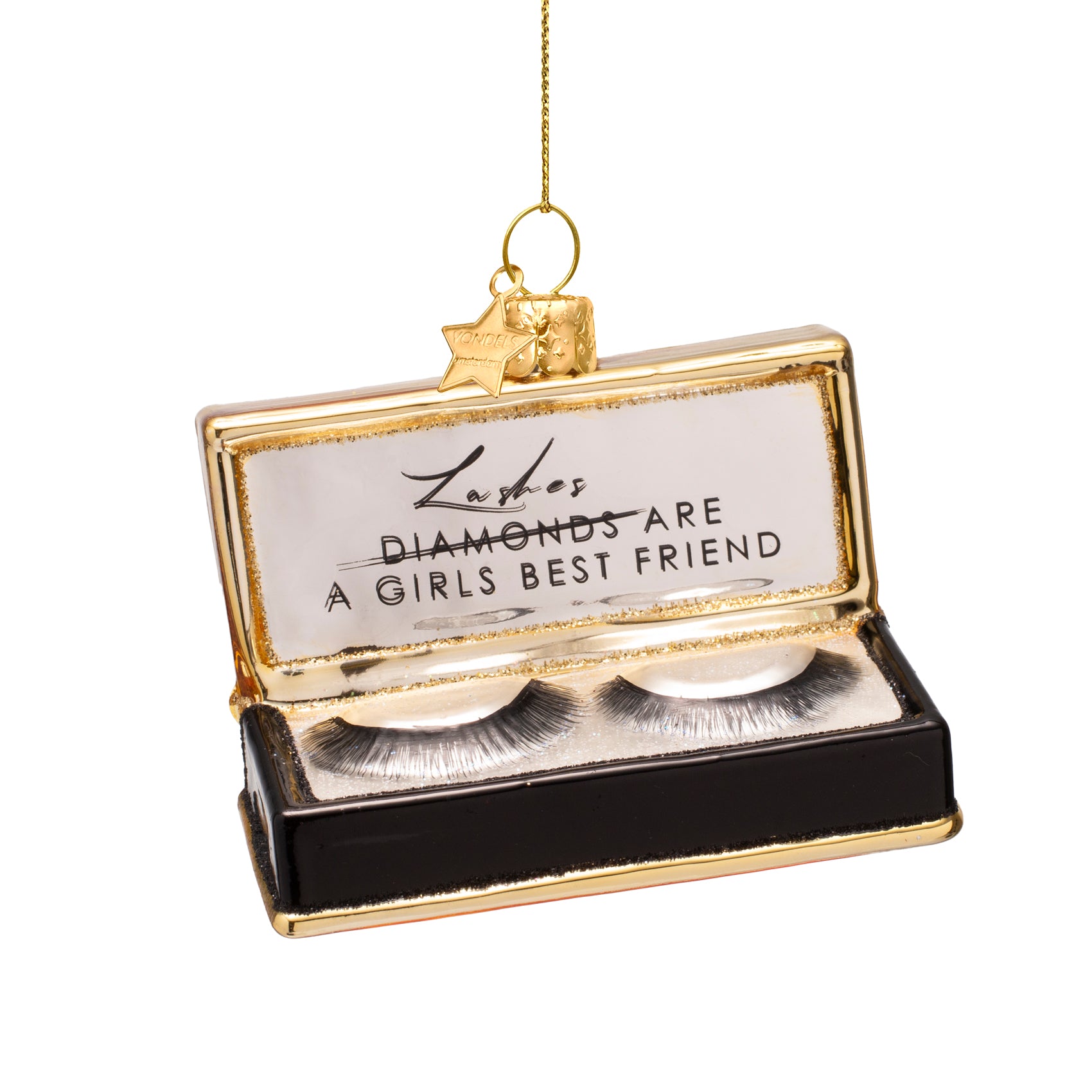 Voor de echte beauty lover! Dit glamoureuze glazen wimper-ornament is een knipoog naar elke make-up queen. De stijlvolle zwarte verpakking met gouden details en de tekst “Lashes are a girl’s best friend” maakt dit ornament onweerstaanbaar chic.